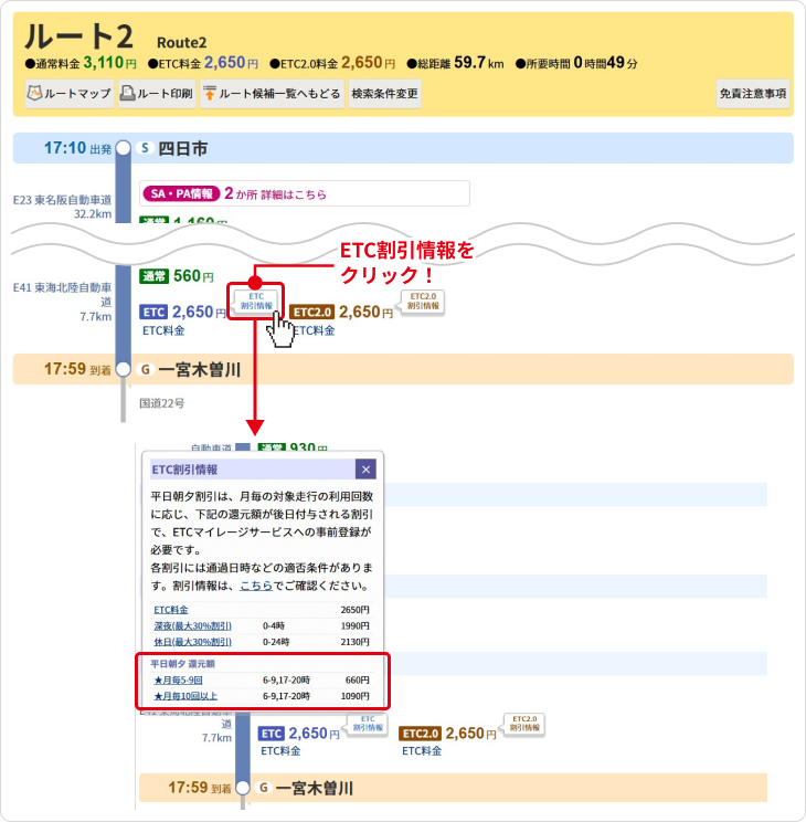 ただし迂回後の料金が直通料金を下回る場合には、料金調整はされませんので実走行を基に平日朝夕割引の回数のカウントや還元額が付与されます。