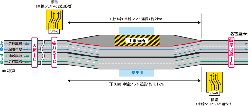 工事区間では車線幅員が狭くなり、車線シフトをおこないます。